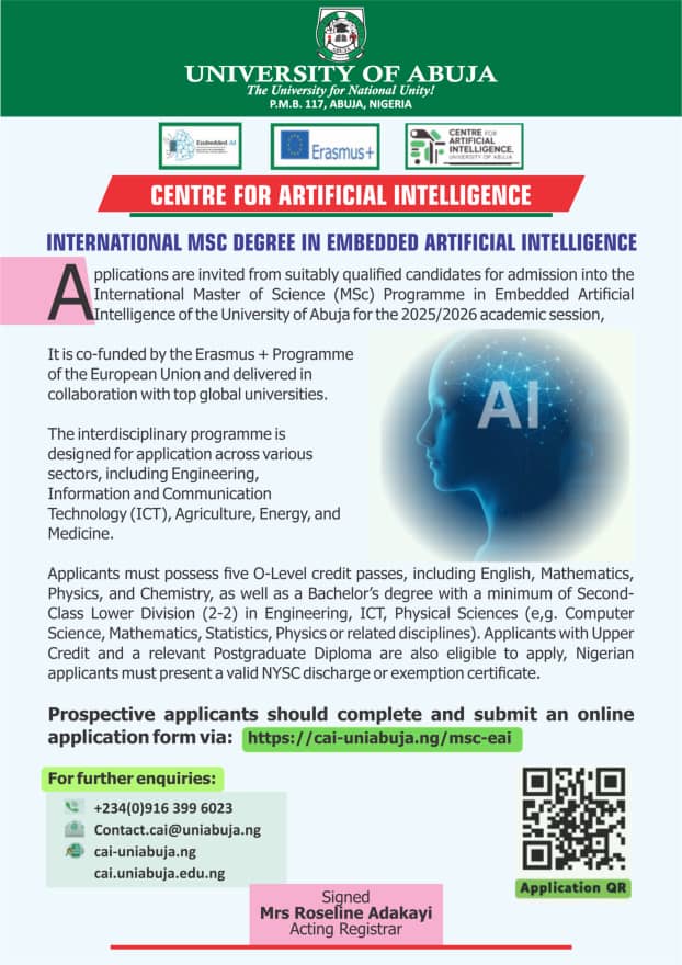 Applications are invited from suitably qualified candidates for admission into the International Master of Science (MSc) Programme in Embedded Artificial Intelligence of the University of Abuja 2025/2026 Academic Session.