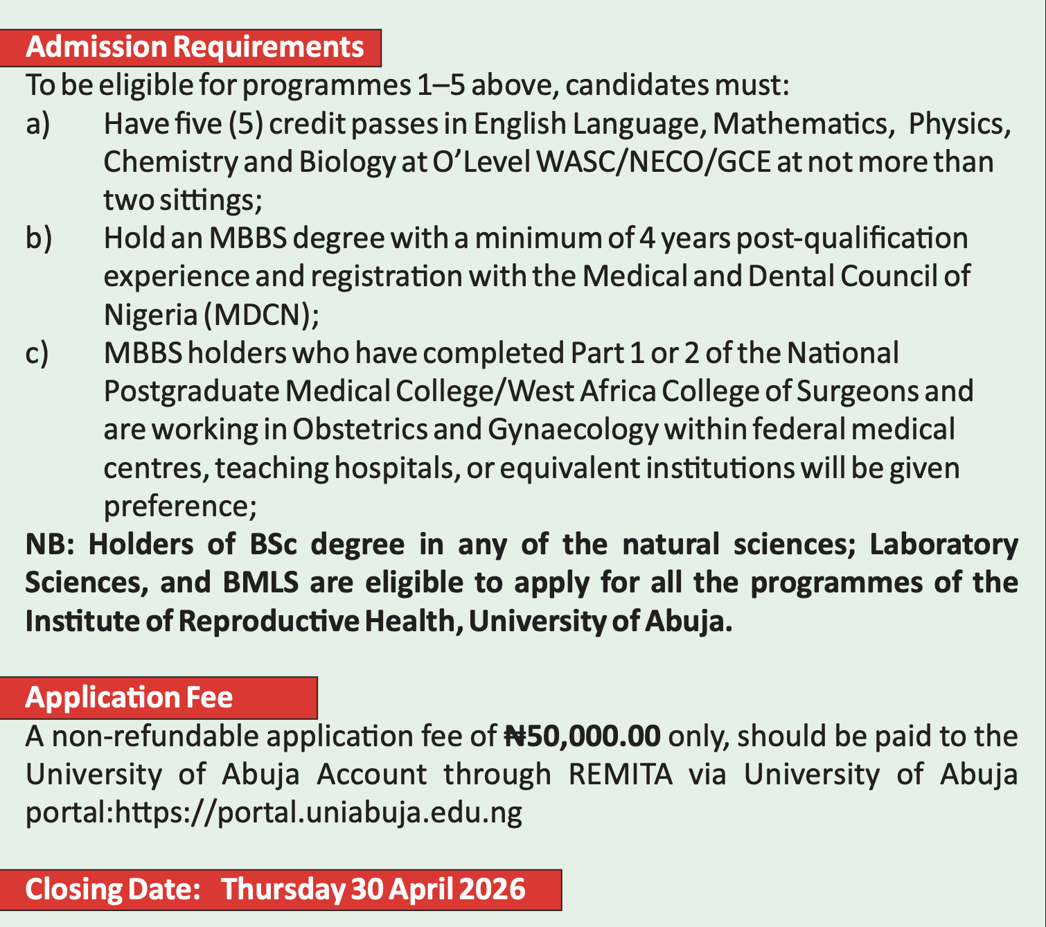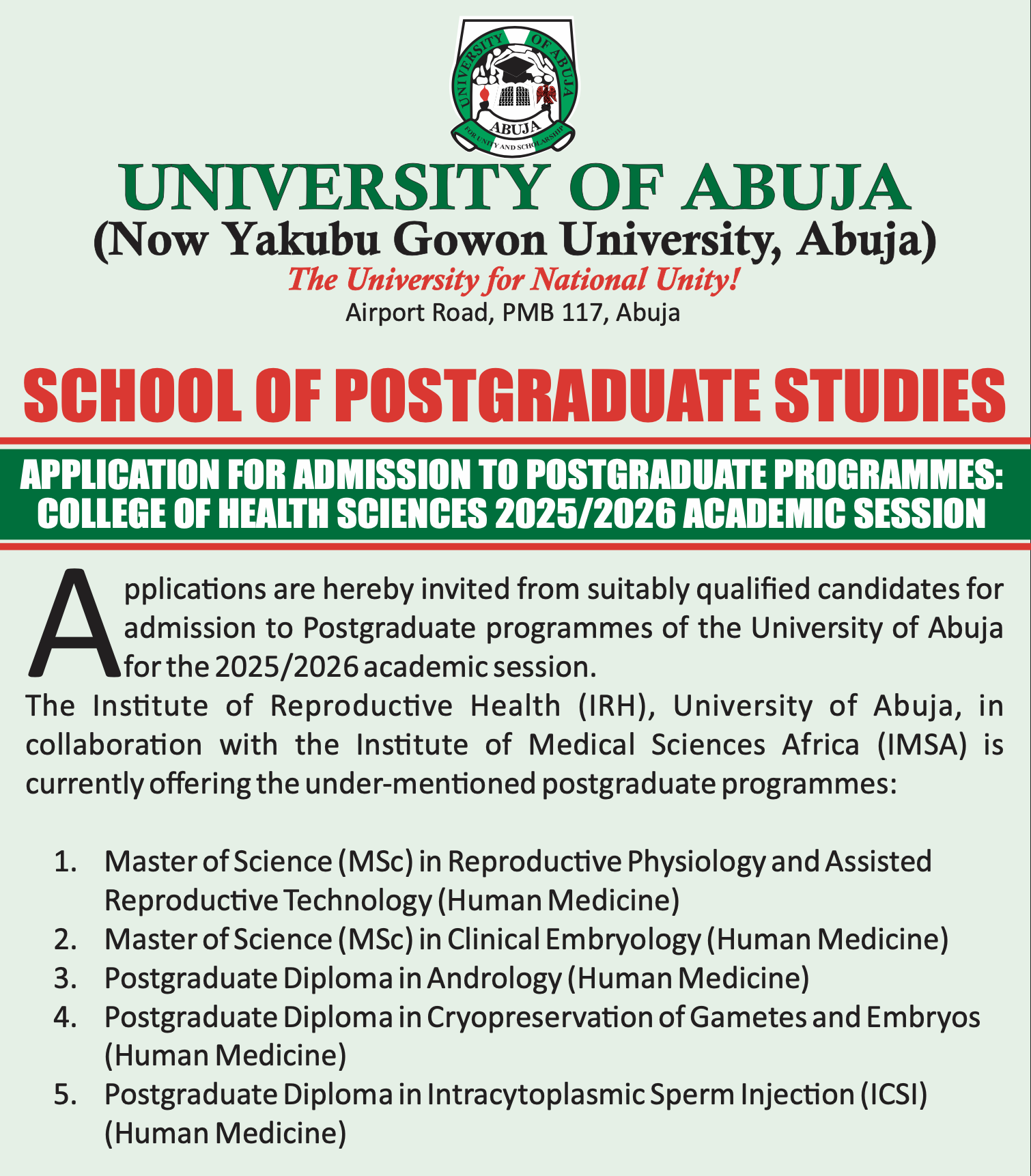 Applications are hereby invited from suitably qualified candidates for admission to Postgraduate programmes of the University of Abuja for the 2025/2026 academic session.
